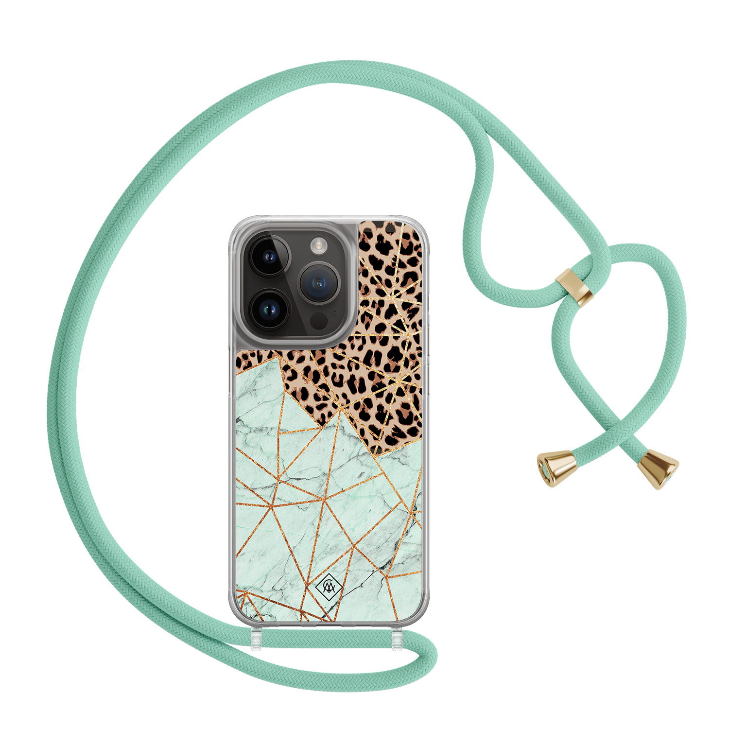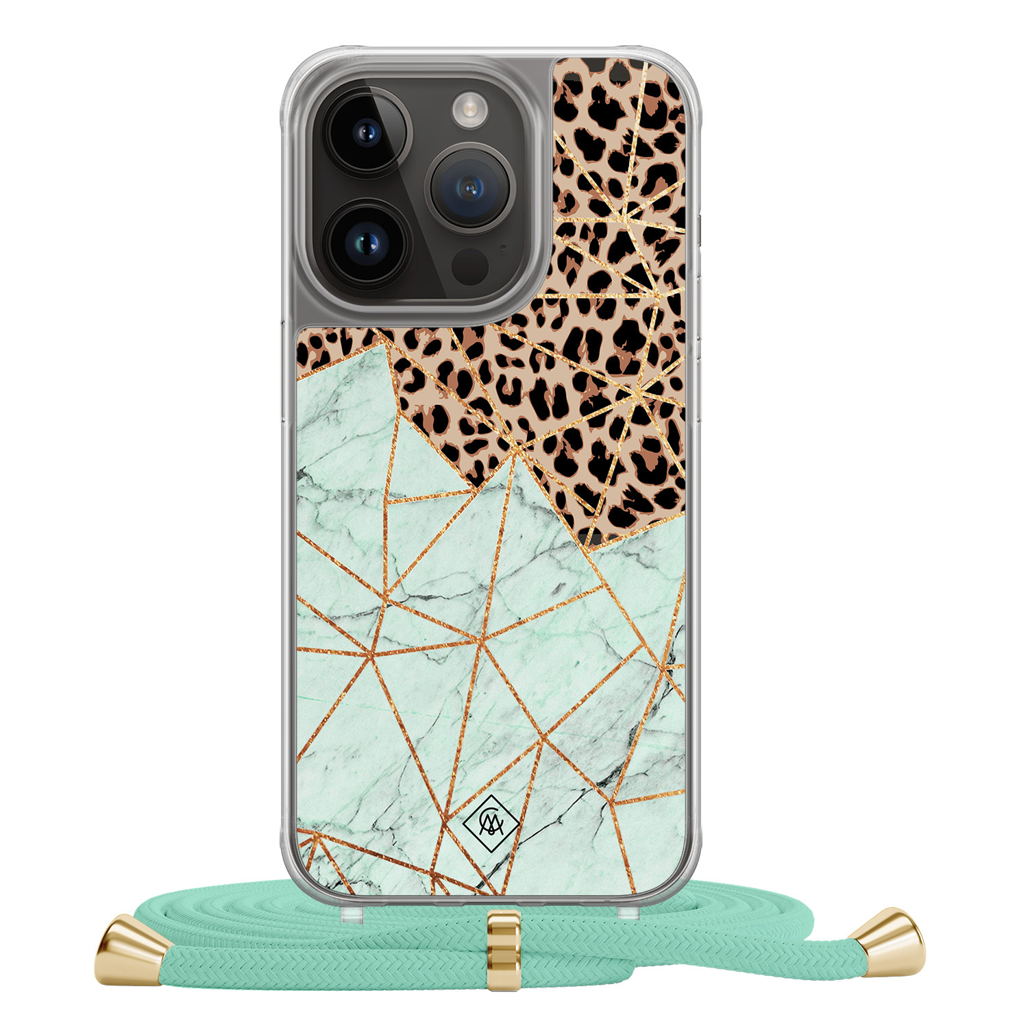 iPhone 14 Pro hoesje met mint koord - Luipaard marmer mint