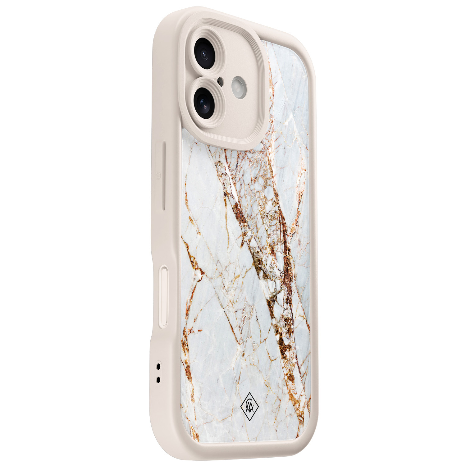 Voeg een vleugje luxe toe aan je iPhone 16 met dit siliconen hoesje in marmer met matte gouden accenten. Een robuuste constructie beschermt je toestel terwijl het slanke design zijn elegantie behoudt. Draadloos opladen is mogelijk.