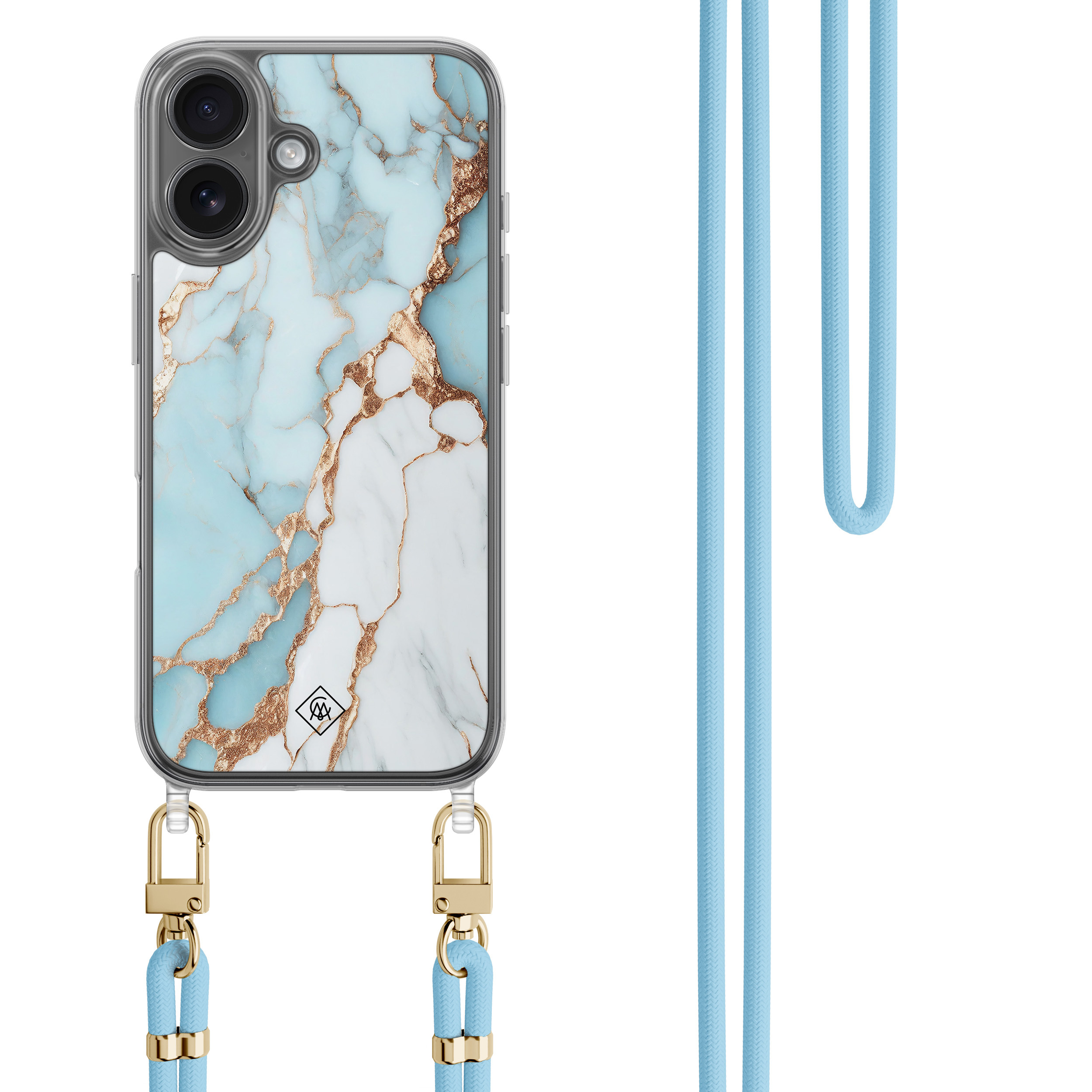 iPhone 16 hoesje met blauw koord - Marmer lichtblauw