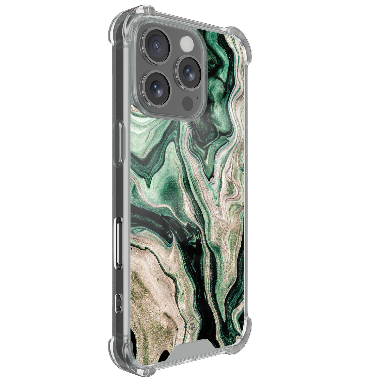 Dompel je iPhone 16 Pro onder in de serene uitstraling van dit green waves backcover hoesje. De robuuste siliconen en opstaande randen bieden optimale bescherming, en het golfpatroon in donkergroen zorgt voor een unieke look.