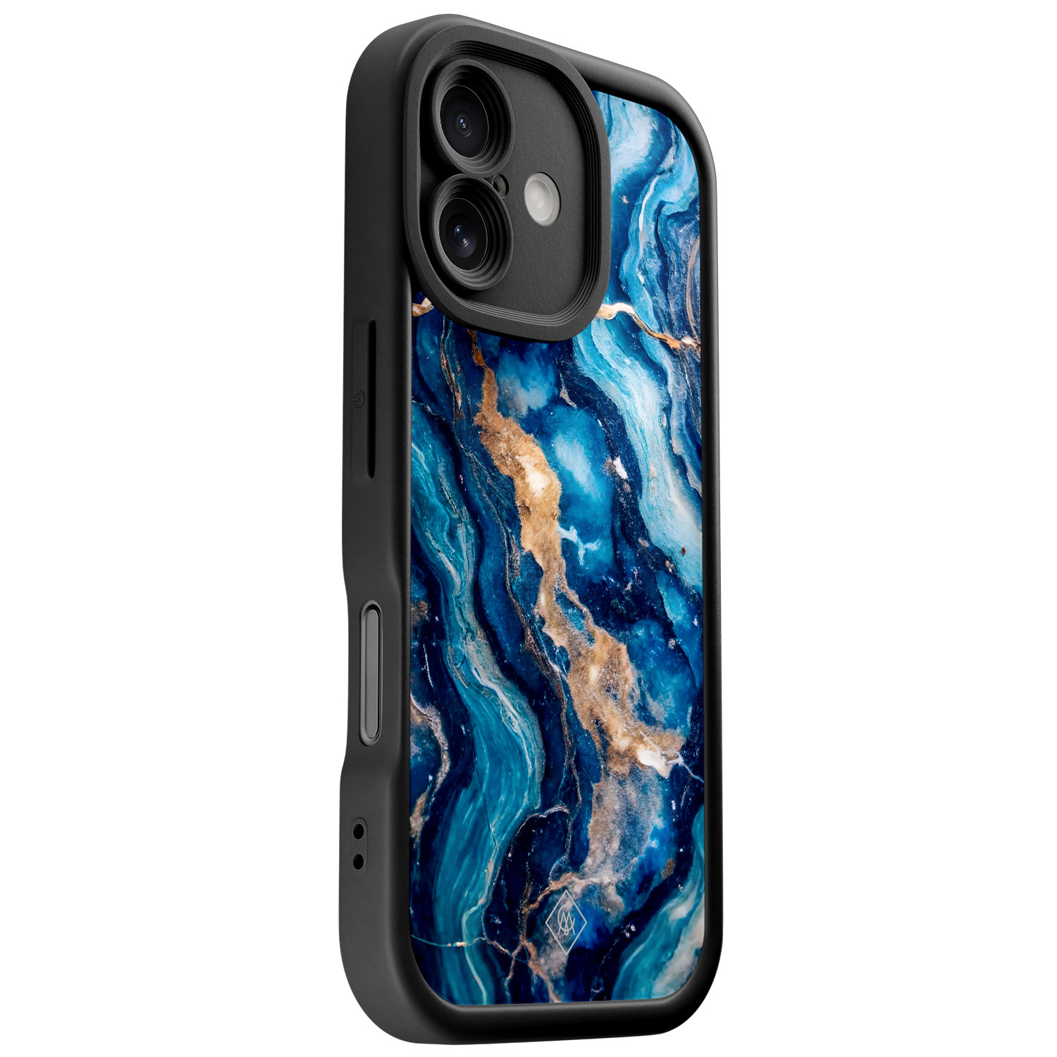 Dit diepe blauw-marmeren hoesje biedt een combinatie van luxe en bescherming. Gemaakt van TPU en siliconen, schokabsorberend en voorzien van verhoogde randen, houdt het jouw iPhone 16 veilig en stijlvol.