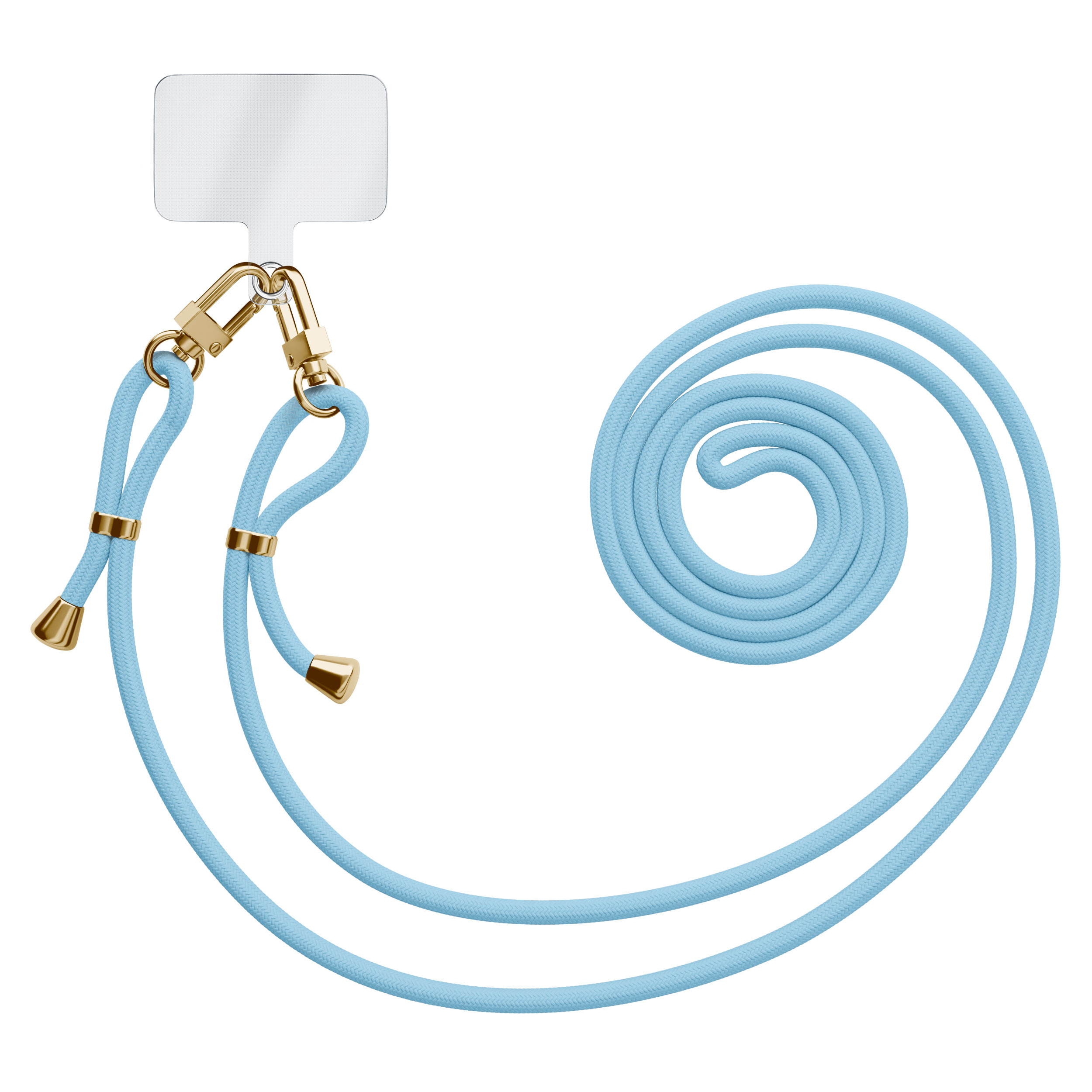 Dit lichtblauwe universele telefoonkoord met dubbele gouden sluitingen van Casimoda houdt je telefoon veilig en stijlvol bij de hand. Plaats de patch in je hoesje (geschikt voor al onze cases) en bevestig het koord eenvoudig aan de patch. Ideaal!